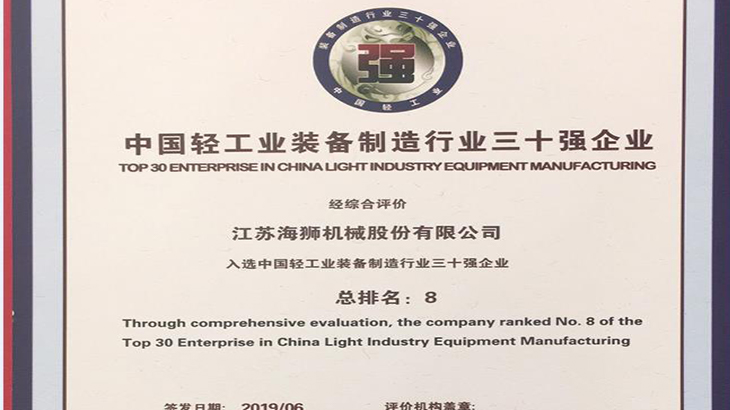 今日江蘇海獅機(jī)械股份有限公司榮獲了中國洗滌機(jī)械行業(yè)十強(qiáng)首位,中國輕工業(yè)裝備制造行業(yè)三十強(qiáng)企業(yè)第8位,中國輕工業(yè)科技百強(qiáng)企業(yè)第23位為加快建設(shè)強(qiáng)國,推動輕工裝備制造業(yè)做大做強(qiáng),本著嚴(yán)謹(jǐn)、公正、科學(xué)的原則,中國輕工業(yè)聯(lián)合會組織開展了2018年度“中國輕工業(yè)裝備制造行業(yè)三十強(qiáng)企業(yè)”、“中國輕工業(yè)科技百強(qiáng)企業(yè)”評價(jià)