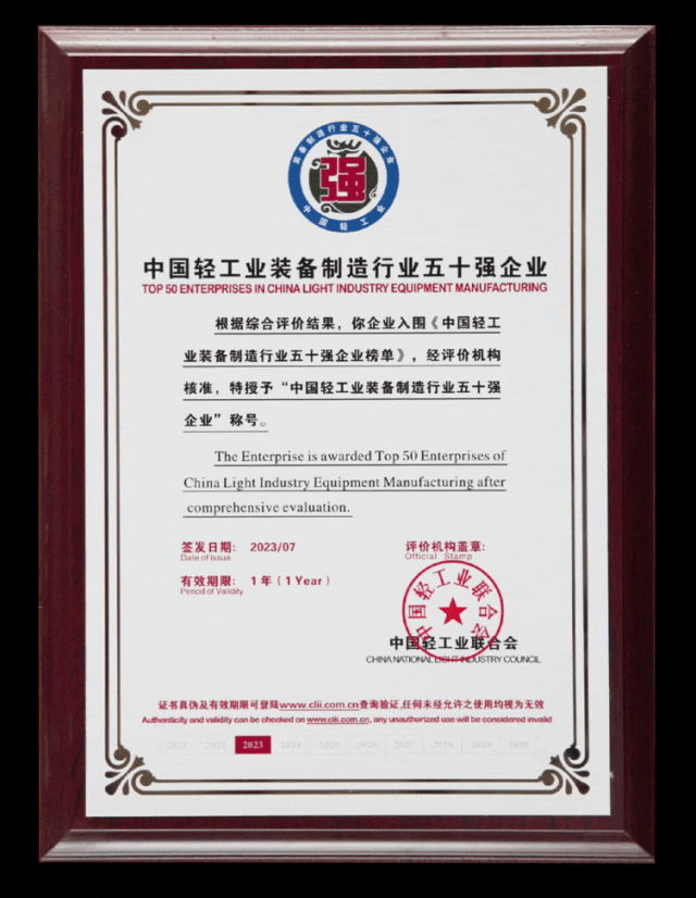 會(huì)上,中國(guó)輕工業(yè)聯(lián)合會(huì)發(fā)布了2022年度輕工裝備五十強(qiáng)企業(yè)評(píng)選結(jié)果,江蘇海獅機(jī)械名列第15位。