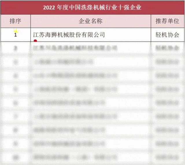 同時(shí),由中國(guó)輕工機(jī)械協(xié)會(huì)推薦,榮獲2022年度中國(guó)洗滌機(jī)械行業(yè)十強(qiáng)企業(yè)中,江蘇海獅機(jī)械榮居榜首,繼續(xù)領(lǐng)跑工業(yè)洗滌機(jī)械行業(yè),展現(xiàn)出54年耕耘工業(yè)洗滌機(jī)械行業(yè)的深厚積淀和卓越成績(jī)。