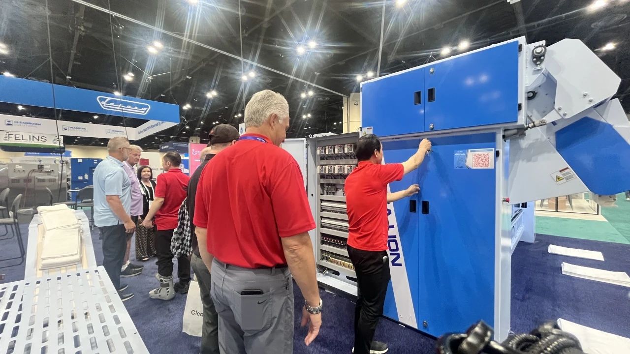 “Titanium”鈦系列洗脫機與烘干機,聚焦高效洗滌與節(jié)能降耗雙重優(yōu)勢。通過精準控溫、智能水循環(huán)系統(tǒng)及變頻電機技術(shù),實現(xiàn)單位時間內(nèi)更高洗滌量和烘干量的同時,大幅降低水、電、蒸汽消耗,為用戶帶來經(jīng)濟與環(huán)保兼具的卓越體驗 參展人士對這一系列設備表現(xiàn)出了濃厚興趣,在現(xiàn)場海獅人員的詳細操作講解下,他們對中國制造的研發(fā)制造實力有了更深刻的認識,紛紛為海獅機械的創(chuàng)新能力點贊。